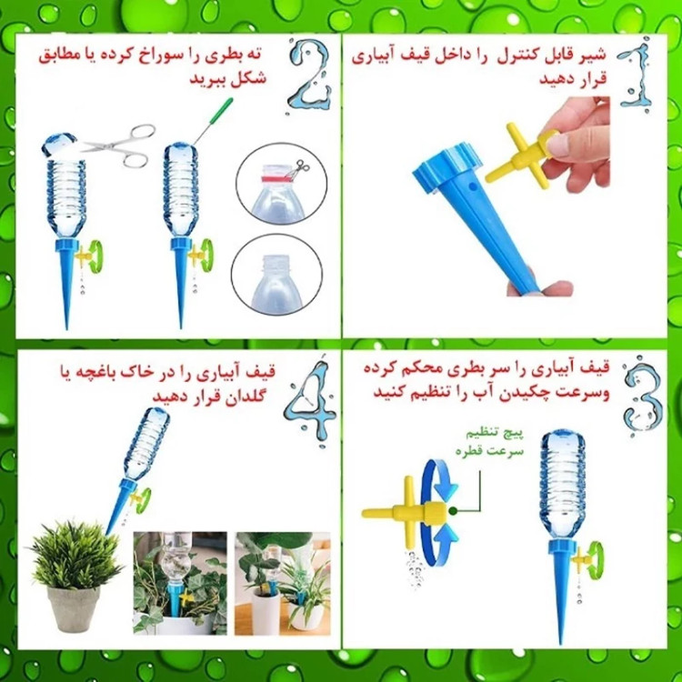 فیتیله آبیاری قطره ای ، ابزاری نوین و کارآمد برای آبیاری گیاهان داخل گلدان بدون حضور فیزیکی در محل می باشد . پایه محصول شبیه به یک قیف طراحی شده است که بر روی سری بطری نصب می شود . همراه پایه شیر بعلاوه ای شکلی وجود دارد که باید به سوراخ داخل قیف متصل شود ، پس از آن می توانید پایه را در حالی که بر روی بطری نصب شده داخل خاک گلدان فرو برده و ثابت کنید ، حالا شیر خروجی را به میزان مورد نیاز گیاه باز و خروجی آب را تنظیم کنید ، بدین ترتیب به تدریج گلدان آبیاری خواهد شد ، بدون اینکه نیازی به حضور فیزیکی شما در محل وجود داشته باشد ، بدین ترتیب گیاهان حتی در نبود شما برای مدتی خشک و یا پلاسیده نخواهند شد و آبیاری آنها انجام خواهد می گیرد . فیتیله آبیاری گلدان ارائه شده در بسته بندی 6 عددی می باشد که می توانید از آن برای آبیاری گیاهان خانگی و یا محیط پیرامون خود به ویژه در زمان غیبت استفاده کنید .