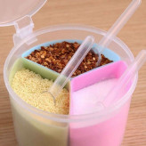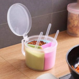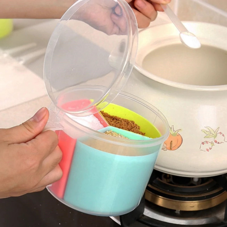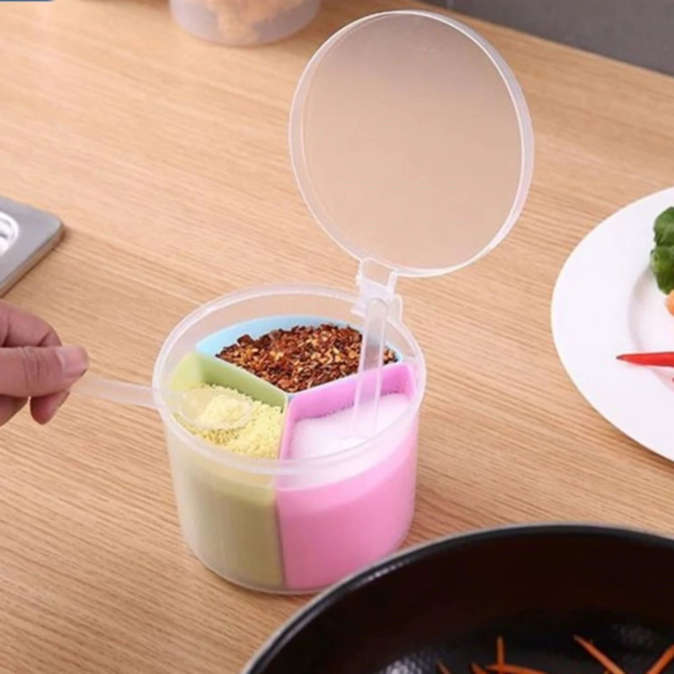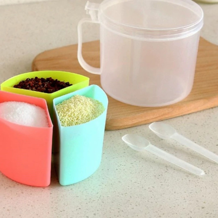 جا ادویه سه تایی دسته دار ، محصولی با طراحی جدید و فانتزی می باشد که تولید شده از جنس پلاستیک مقاوم و بسیار با کیفیت است . این جا ادویه ای فانتزی ، طرح ظاهری مشابه به یک استوانه را دارد و شامل سه محفظه مجزا برای نگهداری ادویه به همراه سه قاشق می باشد که در یک محفظه اصلی مجهز به درب آسان بازشو قرار دارند . رنگ این محصول ترکیبی می باشد که زیبایی خاصی را به آن می دهد . استفاده از این جای ادویه به دلیل داشتن دستگیره ، در هنگام آشپزی کار بسیار ساده ای است.