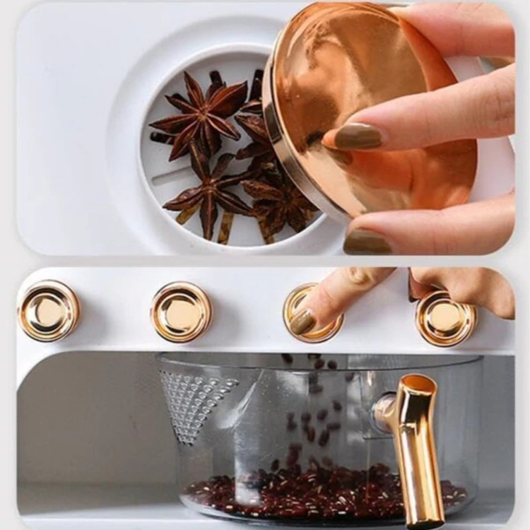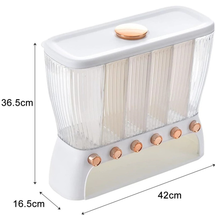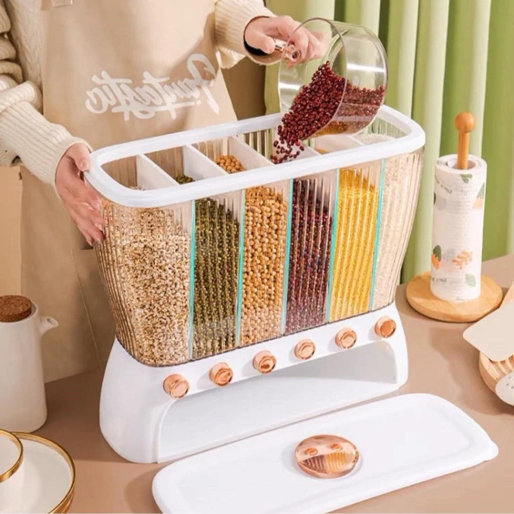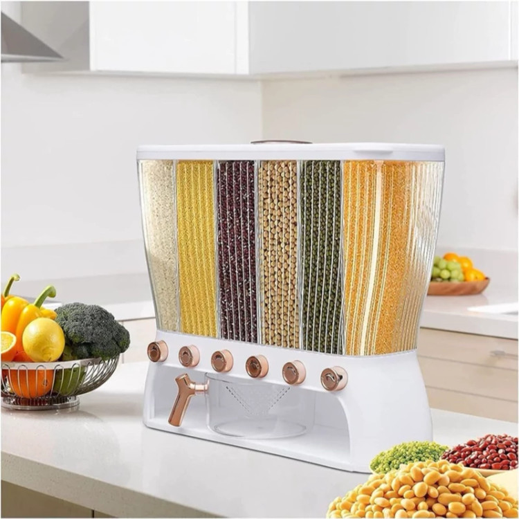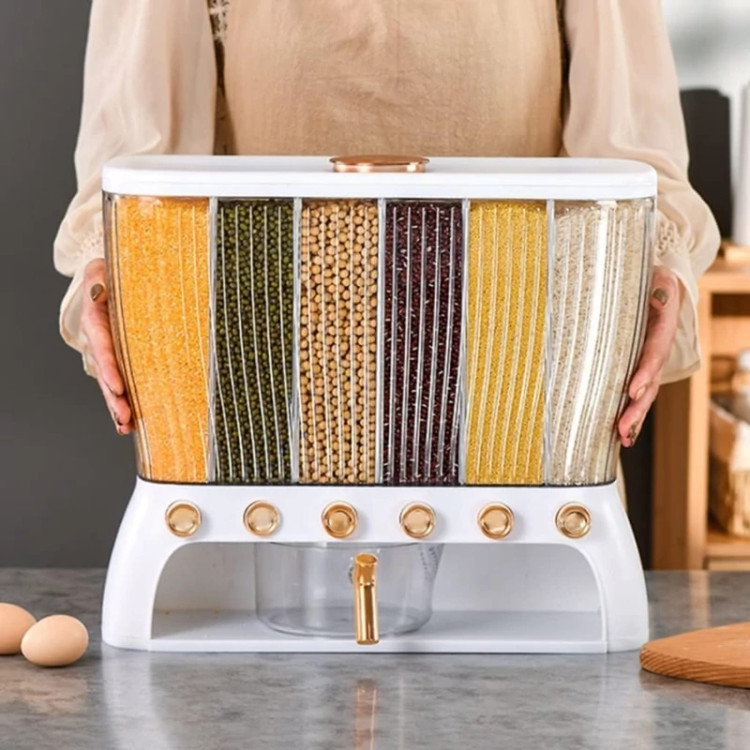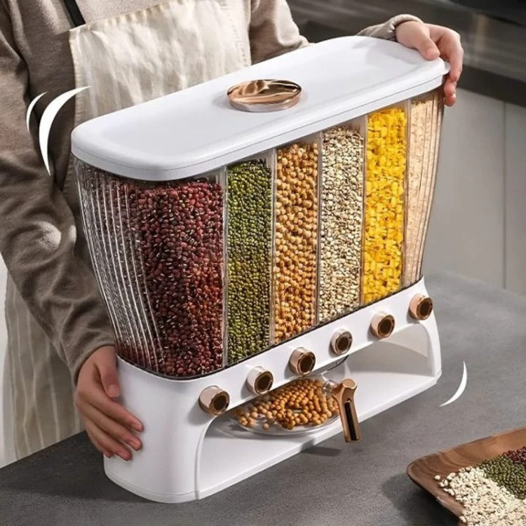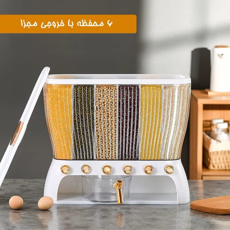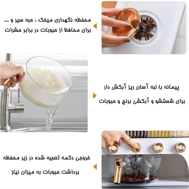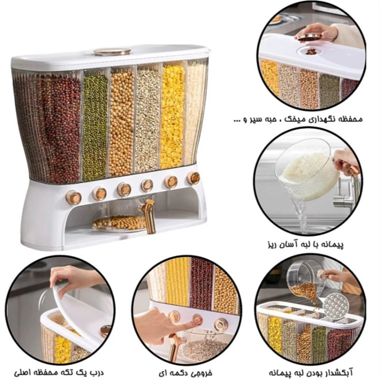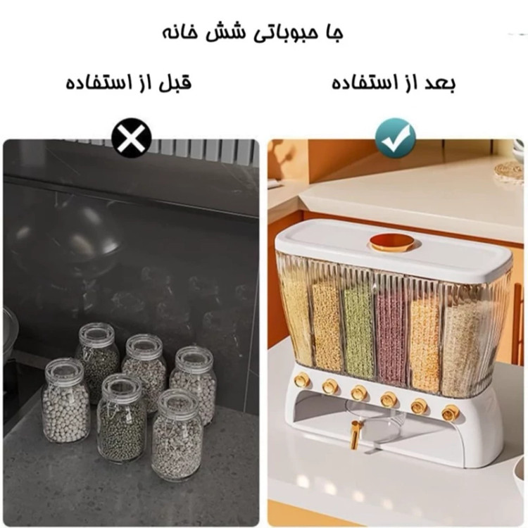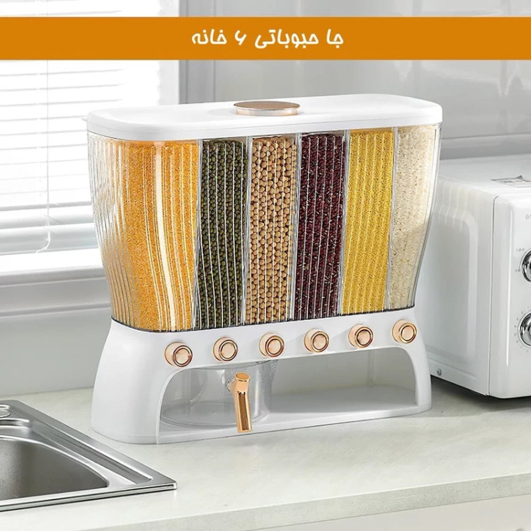 جا حبوباتی 6 خانه ، نمونه ای جدید با طراحی مدرن و بسیار زیبا که نمی توان به راحتی نگاه از آن برداشت . این کالا ار نوع رومیزی و تولید شده از جنس پلاستیک فشرده مقاوم و بسیار باکیفیت است . محفظه اصلی شفاف بوده به طوری که قابلیت مشاهده محتویات درون آن از بیرون وجود دارد ، بنابراین علاوه بر ایجاد زیبایی ظاهری بیشتر ، از نوع و میزان محتویات درون آن می توان به سادگی مطلع شد . فضای داخلی به 6 قسمت مجزا تقسیم شده که هر کدام خروجی اختصاصی مربوط به خود را در قسمت زیرین دارند ، بنابراین می توان حبوبات مختلف را به صورت یک جا و البته تفکیک شده از یکدیگر درون محفظه ها قرار داد تا همواره به سادگی در دسترس و قابل استفاده باشند . خروجی محفظه ها از نوع دکمه ای است ، نمونه ای که امکان برداشت حبوبات به میزان نیاز و البته ساده ترین حالت ممکن را برای کاربر فراهم می کند . به همراه جا حبوباتی شش خانه یک ظرف پیمانه نیز وجود دارد که کاملاً شفاف است و لبه آسان ریز آبکش دار دارد ، به طوری که می توانید حبوبات برداشته شده از داخل محفظه ها را به سادگی درون همان پیمانه شستشو و آبکشی نمایید بدون اینکه نیازی به ظرف دیگری داشته باشید . همه حبوبات را یکجا و در یک ظرف به صورت مجزا از هم در اختیار خواهید داشت بدون اینکه به ظروف حبوبات متعدد نیازمند باشید .