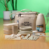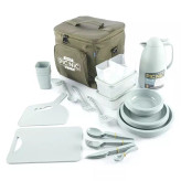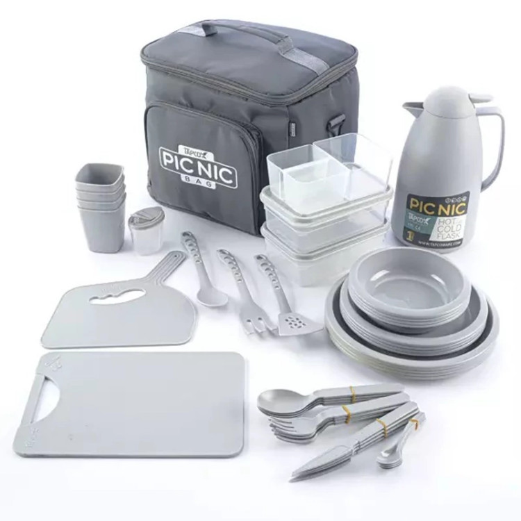 محتویات داخل ساک شامل : یک عدد فلاسک 1 لیتری ، قاشق ، چنگال و کفگیر آشپزی ، دو عدد باکس که هر کدام درون خود ظروف کوچکتری برای استفاده مجزا و یا تقسیم فضای داخلی ظرف را دارند ، 4 عدد بشقاب ، 4 عدد کاسه ، 4 عدد پیش دستی ، 4 عدد قاشق غذاخوری ، 4 عدد چنگال ، 4 عدد کارد میوه خوری ، 4 عدد قاشق چای خوری ، 4 عدد لیوان به همراه نمکدان دوقلو ، بادبزن و تخته گوشت