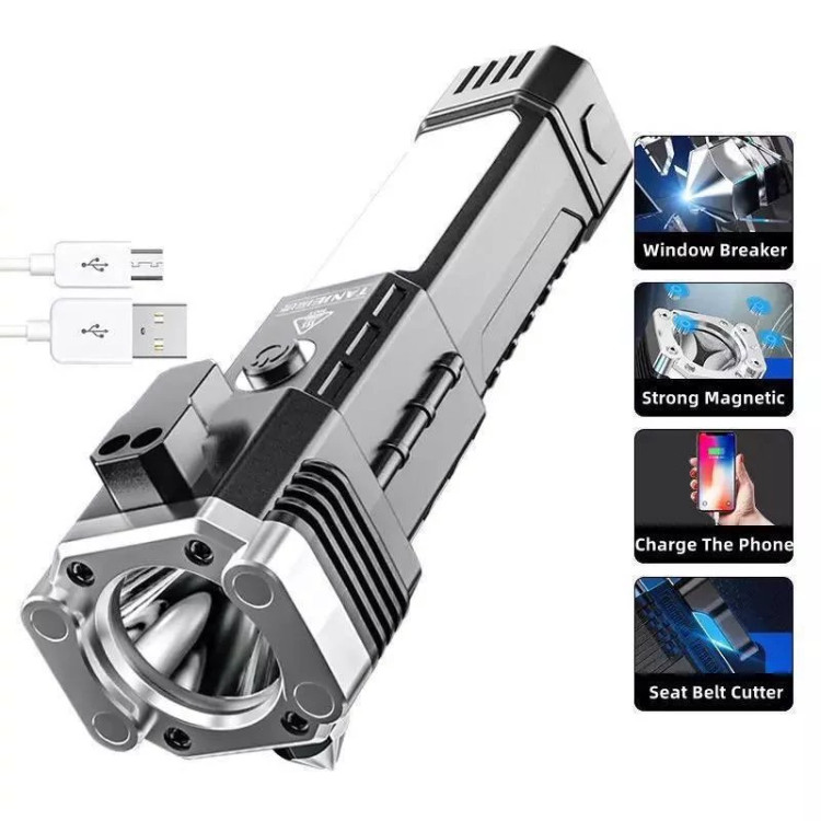 چراغ قوه چند کاره ( دارای پاور بانک/تسمه بر /قابلیت شکستن شیشه /وپرتاب و نور و ….