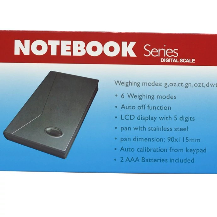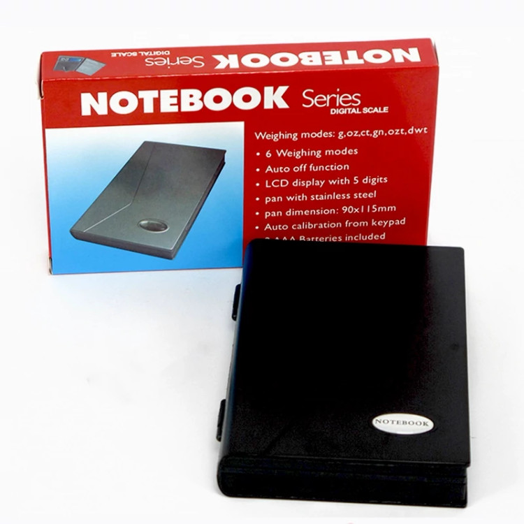 این ترازو که با نام تجاری نوت بوک عرضه شده است دارای دقتی به اندازه 0.01 تا 2000 گرم بوده و کفه بزرگ وزن کشی آن استفاده برای وزن کشی انواع اجسام مختلف را آسان میکند که علاوه بر آن دقت وزن کشی را بسیار افزایش می دهد. برای استفاده از آن نیاز به دو عدد باتری نیم قلمی بوده و توانایی تغییر نمایش وزن را بر حسب قیراط، انس و همچنین گرم دارد. از این ترازو برای کارهای مختلفی از قبیل وزن کشی داروها یا مواد شیمیایی، وزن کشی لوازم خیاطی، توزین مواد غذایی مانند ادویه جات و… میتوان استفاده کرد که به دلیل کوچک بودن ابعاد آن ( به اندازه یک عدد نوت بوک کوچک) به راحتی قابل حمل می باشد.