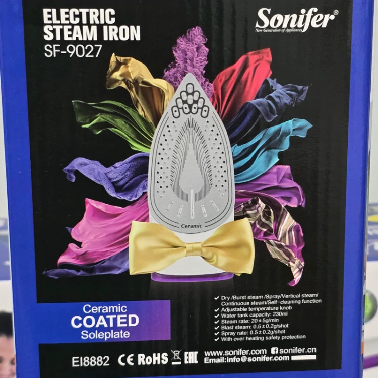 ✅ اتو بخار سونیفر SF-9027 ⬅️ کف سرامیکی ضدرسوب ⬅️ توان مصرفی 2000 وات ⬅️ قابلیت اسپری کردن آب ⬅️ چرخش 360 درجه ⬅️ سیستم ضد رسوب ⬅️ بخاردهی عمودی