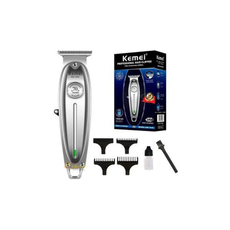 ماشین اصلاح سر خط زن کیمی KEMEI KM-1949 hair trimmer ماشین اصلاح با تیغه استیل ضد زنگ است که قابلیت اصلاح صفر زن و خط زن را دارد که مناسب برای افراد حرفه ای و استفاده شخصی در منزل برای مرتب کردن و خط انداختن مو و خط ریش است.بدنه ماشین اصلاح مدل KM-1949 از استیل است که کارایی و دوام بالایی دارد و همچنین از طراحی ارگونومیک بهره برده است. منبع تغذیه این ماشین اصلاح باطری لیتیوم یونی 1400 میلی آمپر است که با 2/5 ساعت شارژ 180 دقیقه اجرا ارائه می دهد و قابلیت شارژ به وسیله ی USB را دارد که به راحتی می توانید با پاوربانک، کامپیوتر، شارژر خودرو ... آن را شارژ کنید و هرجا که نیاز دارید از ماشین اصلاح خود استفاده نمایید.ماشین اصلاح KM-1949 ( کیمی 1949) دارای سه شانه اتصال به تیغه 1-2-3 میلی متر استو همچنین مجهز به چراغ نشانگر می باشد.
