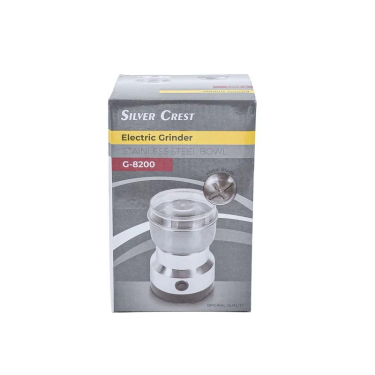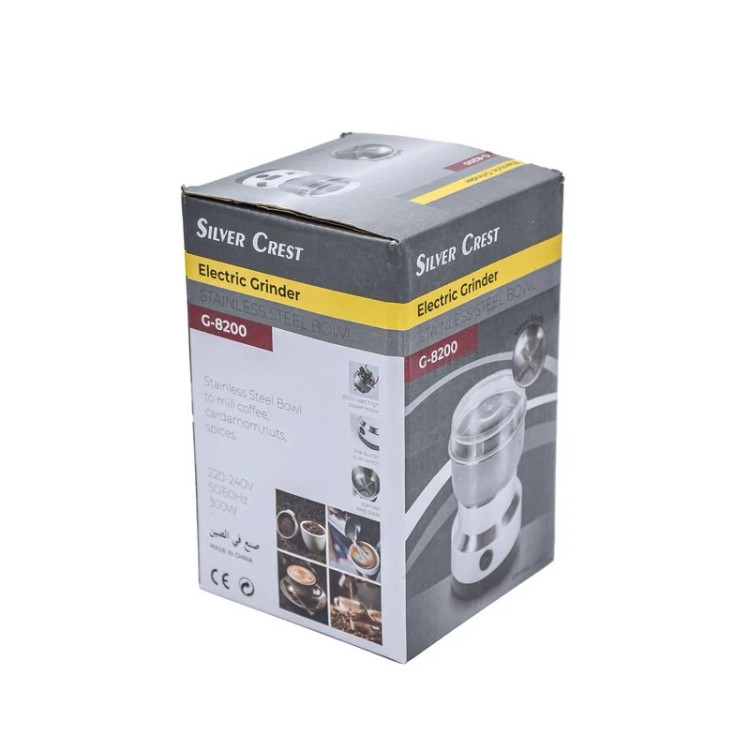 آسیاب برقی 300 وات سیلور کرست مدل 8200 با تیغههای فولادی و استیل ضد زنگ، دارای درب شفاف و کلید ایمنی درب است. با توان مصرفی 300 وات، جنس بدنه آن از استیل و پلاستیک است. این آسیاب قهوه، زعفران، ادویه، هل، خشکبار، برنج و دانههای ریز و درشت را به راحتی آسیاب میکند. همچنین دارای مخزن داخلی از جنس فولاد ضد زنگ است.
