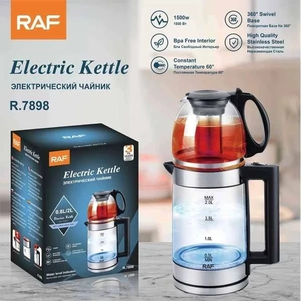 چای ساز روهمی 1500 وات راف مدل 7898 از سری محصولات باکیفیت و کاربردی برند RAF است که در بازار ایران به دلیل محبوبیت نوشیدنی چای، این محصول نیز فروش خوبی دارد. این چای ساز از جنس پیرکس بسیار باکیفیت و نشکن ساخته شده و با توان مصرفی 1500 وات، کتری پیرکس 2 لیتری و قوری پیرکس 0.8 لیتری در کمترین زمان ممکن حدوداً 5دقیقه آب جوش و چای شما را آماده خواهد کرد و به لطف جنس عایق این چای ساز تا مدت زیادی آب جوش، چای یا دمنوش شما گرم خواهد ماند.