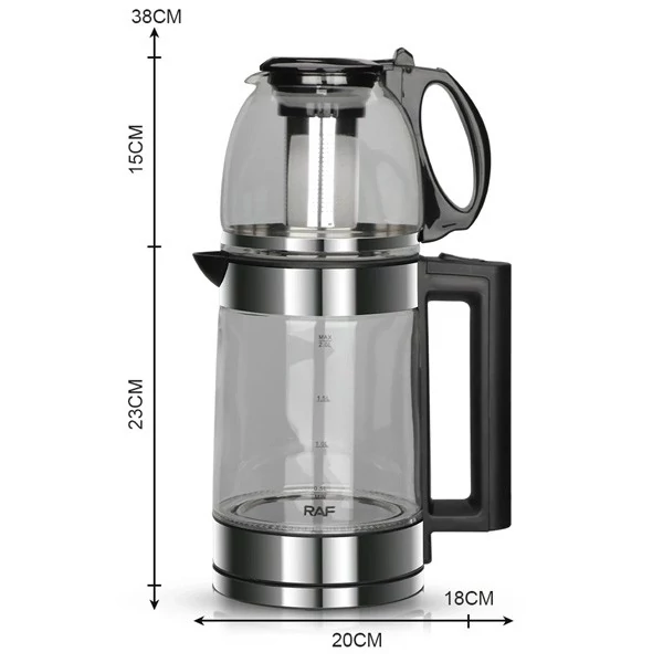 چای ساز روهمی 1500 وات راف مدل 7898 از سری محصولات باکیفیت و کاربردی برند RAF است که در بازار ایران به دلیل محبوبیت نوشیدنی چای، این محصول نیز فروش خوبی دارد. این چای ساز از جنس پیرکس بسیار باکیفیت و نشکن ساخته شده و با توان مصرفی 1500 وات، کتری پیرکس 2 لیتری و قوری پیرکس 0.8 لیتری در کمترین زمان ممکن حدوداً 5دقیقه آب جوش و چای شما را آماده خواهد کرد و به لطف جنس عایق این چای ساز تا مدت زیادی آب جوش، چای یا دمنوش شما گرم خواهد ماند.