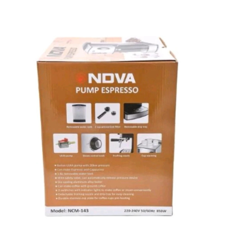 یکی از بهترین اسپرسو ساز های برند ندوا محسوب می شود، که با توجه به قیمت بسیار مناسبی که دارد، یکی از پرفروش ترین اسپرسو ساز های این برند نیز به شمار می آید. اسپرسو ساز نوا NCM 143 با قدرت 1000 وات و فشار بخار 20 بار، برای استفاده روزانه در منزل جهت تهیه مدل های مختلف قهوه، گزینه ای مناسب و به صرفه است. بدنه این اسپرسو ساز از جنس استیل است و در برابر خراش و ضربه مقاومت بسیار زیادی دارد. از سیستم گرم کن فنجان بهره می برد و همچنین مجهز به نازل بخار جهت تهیه فوم شیر نیز است. زیر نازل خروجی قهوه دستگاه، یک سینی چکه گیر جهت ذخیره مایعات چکه شده از نازل تعبیه شده است، تا مانع از کثیف شده اطراف دستگاه شود. به طور کلی می توان گفت اسپرسو ساز نوا NCM 143 گزینه ای بسیار مناسب برای افرادی است که قصد خرید یک اسپرسو ساز خوش قیمت و در عین حال کارآمد را دارند.